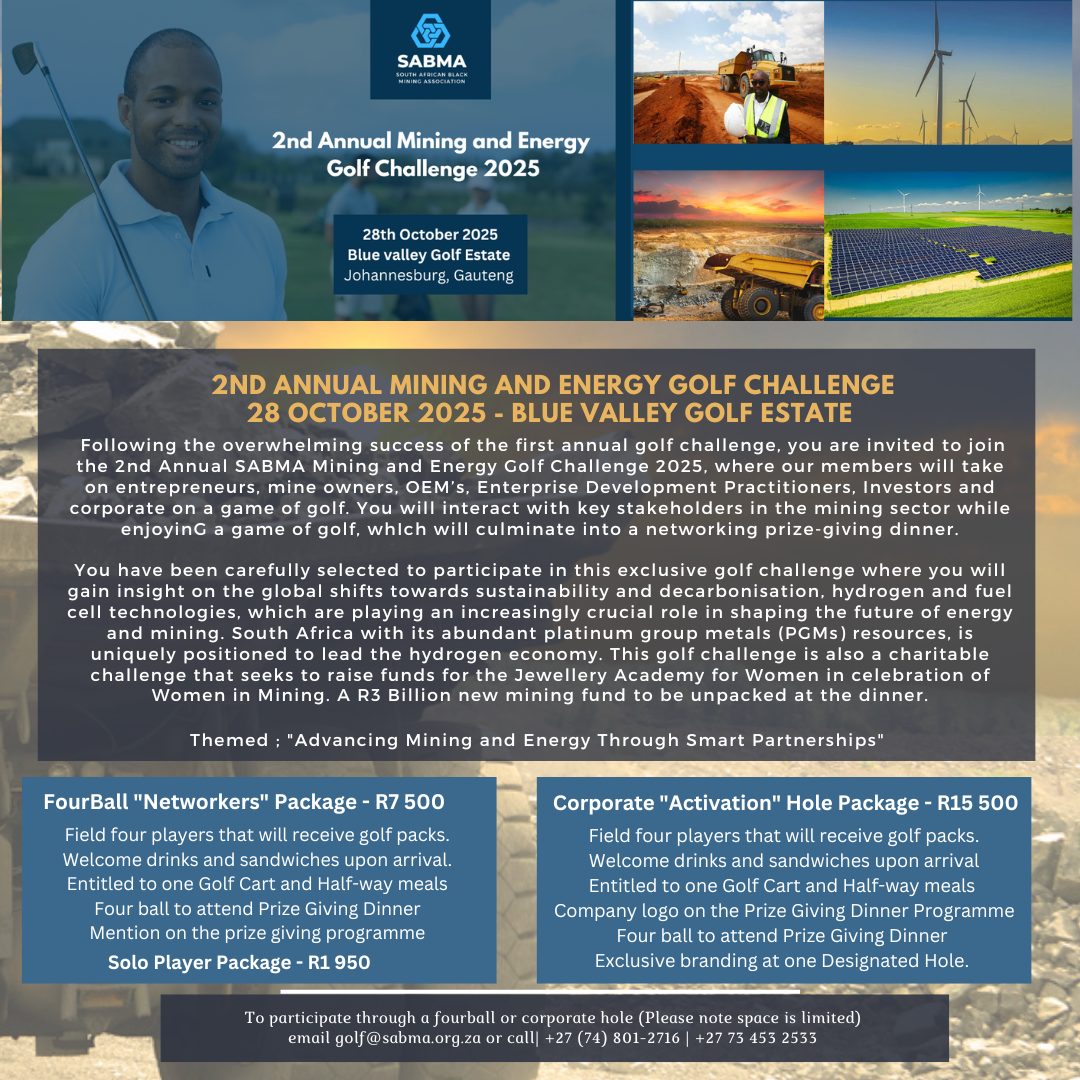 You are invited to join an exclusive golf challenge on the 17th September 2025 at Blue Valley Golf Estate, themed "Forging Partnerships for a Stronger Mining Future", a challenge dedicated to fostering collaboration, investment and supplier development within the mining and energy sectors. As the global mining industry shifts towards sustainability and decarbonisation, hydrogen and fuel cell technologies are playing an increasingly crucial role in shaping the future of energy in mining. South Africa with its abundant platinum group metals (PGMs) resources, is uniquely positioned to lead the hydrogen economy , unlock new investment opportunities, job creation and supplier growth. Join us for a day of golf, strategic discussions, and high impact networking that will position your organisation at the forefront on mining innovation.